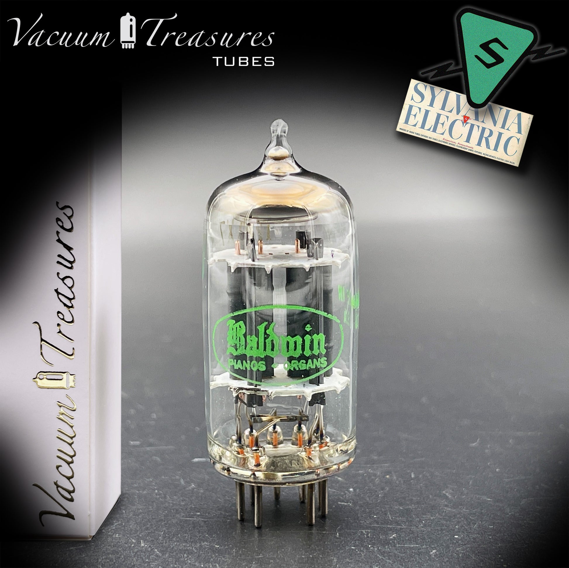 This 12AX7 (ECC83) Baldwin by Sylvania , made in the USA and originally selected for use in Baldwin organs, is a vintage American tube featuring Long Gray Plates and Halo Getter , a construction typical of vintage Sylvania ECC83s.
