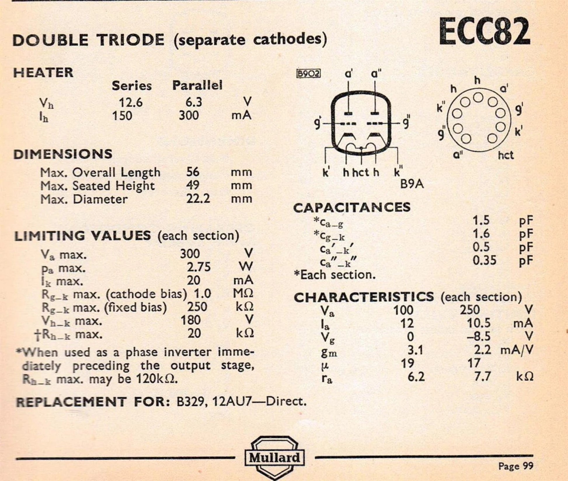 • Manufacturing Code: Gf2 B6K2 → Gfx indicates an ECC82 with the sequential progression of x, i.e. Gf1; Gf2;... indicate production changes - B6K2 B → Mullard, Blackburn - 6 (out of four digits) → 1966 - K → November - 2 → 2nd week of the month