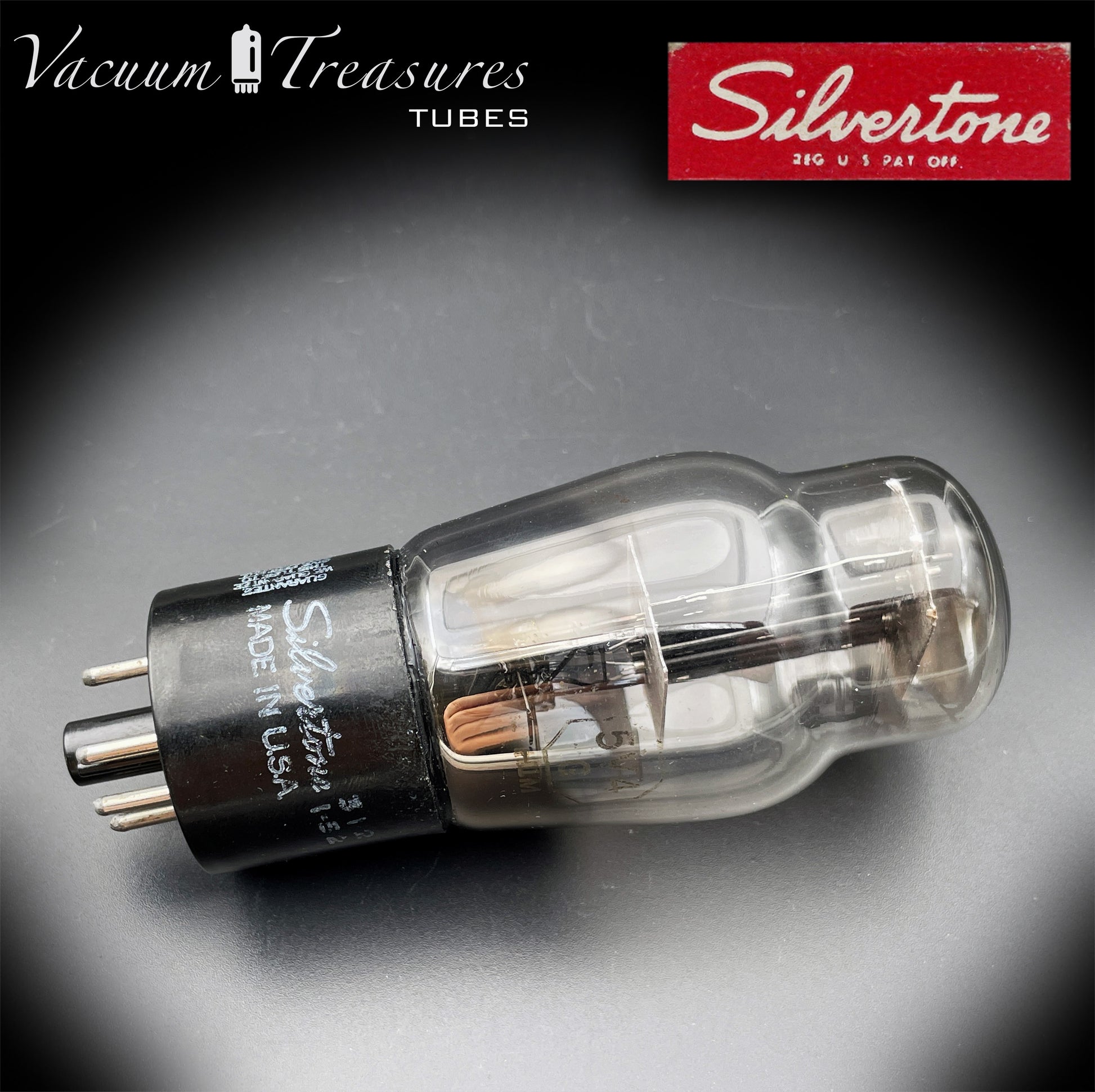 The Silvertone-branded 5V4G/GZ32 , produced in 1951 by Sylvania for the audio line of Sears, Roebuck & Co. , features the classic ST bottle structure, well-machined vertical black plates and square getter at the bottom . It is one of the most musical and transparent versions of the first post-war generation American rectifiers.