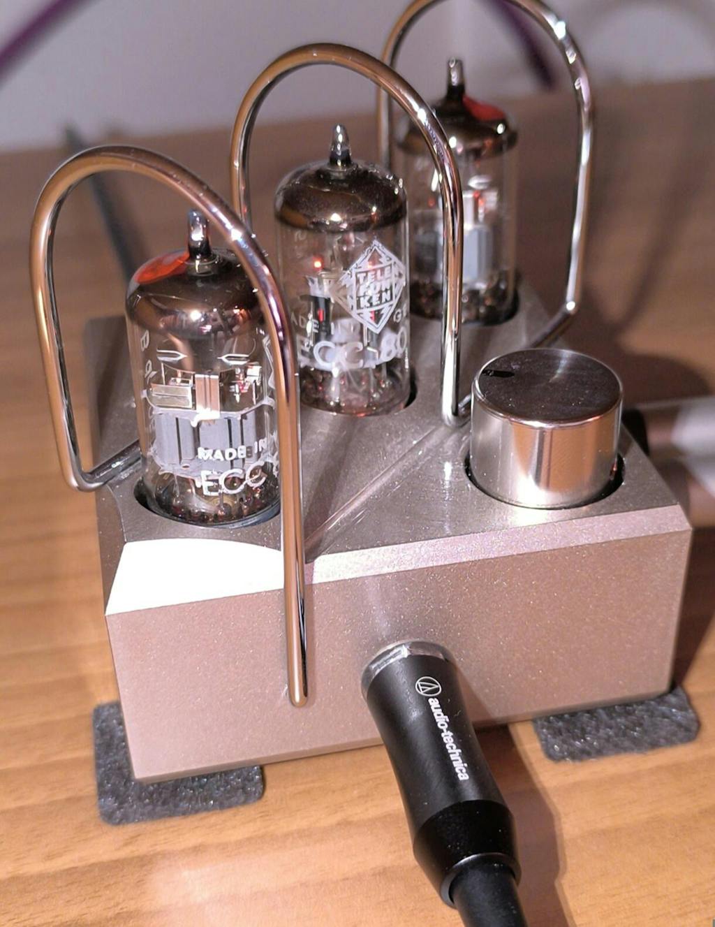 Il suddetto amplificatore Earmax (otl in classe A) monta una ecc81 in posizione centrale come sezione di preamplifcazione e una coppia di ecc88 laterali per la sezione di potenza. Come risaputo, le valvole Telefunken si caratterizzano per grande estensione nella risposta in frequenza e per spiccata attitudine al senso del dettaglio e all'apertura della scena. In particolare modo la coppia di ecc88 appena acquistata, restituisce un suono magico proprio per la chiarezza, il dettaglio e un senso etereo dei suoni che si dipanano in un palcoscenico ampio e ottimamente stratificato. Ciò senza mai il minimo senso di asprezza o spigolosità in una gamma alta e altissima che scorre con una fluidità veramente impressionante!