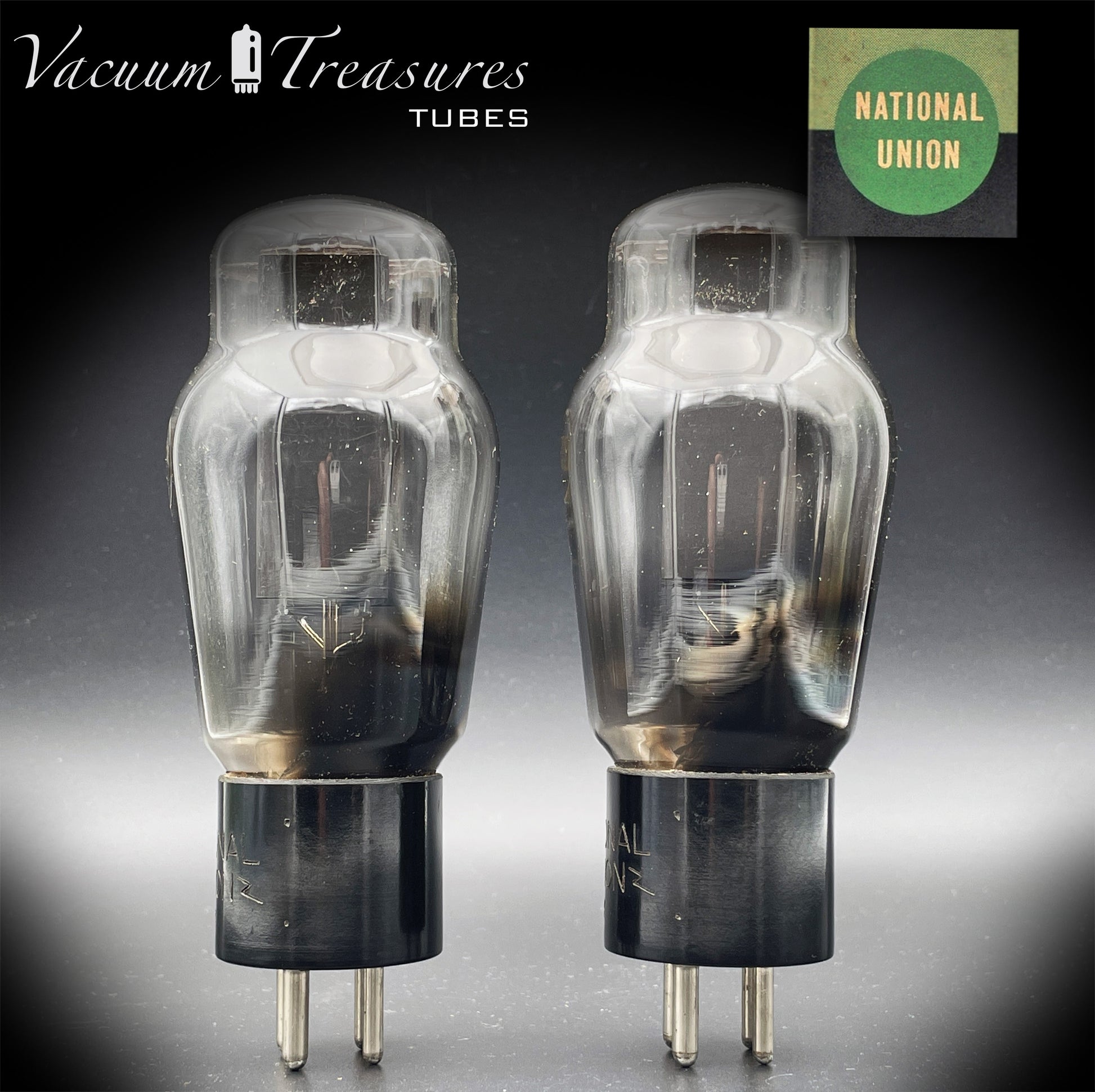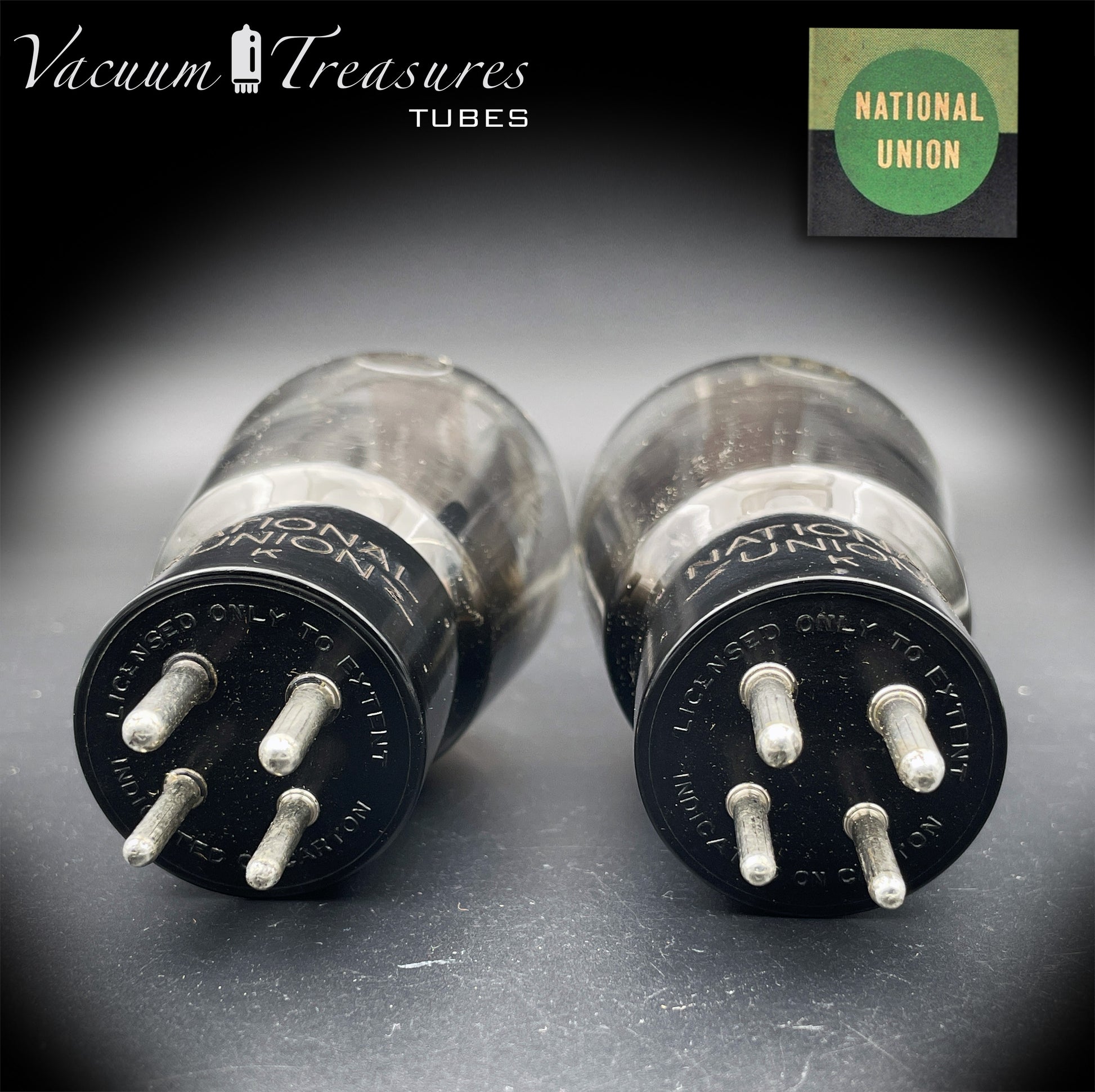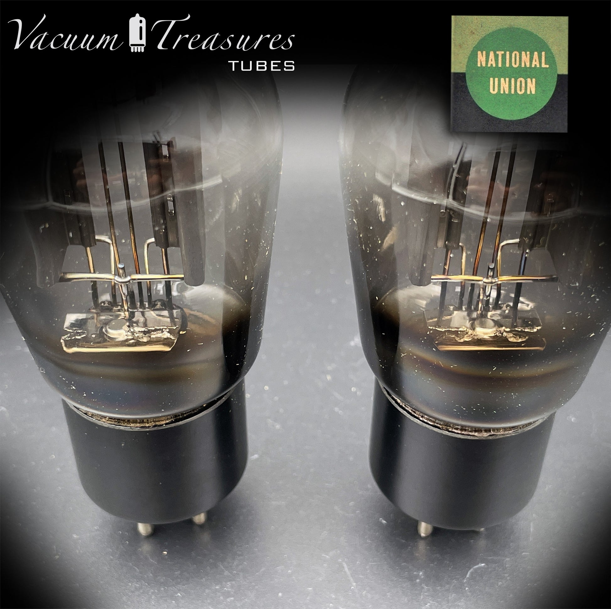 Questi esemplari si presentano in condizioni NOS NIB (New Old Stock – New in Box) e offrono dettagli costruttivi di pregio come le placche nere, i filamenti sospesi (hanging filaments), il foil getter e la base incisa (engraved base), caratteristiche distintive della produzione National Union dell’epoca.