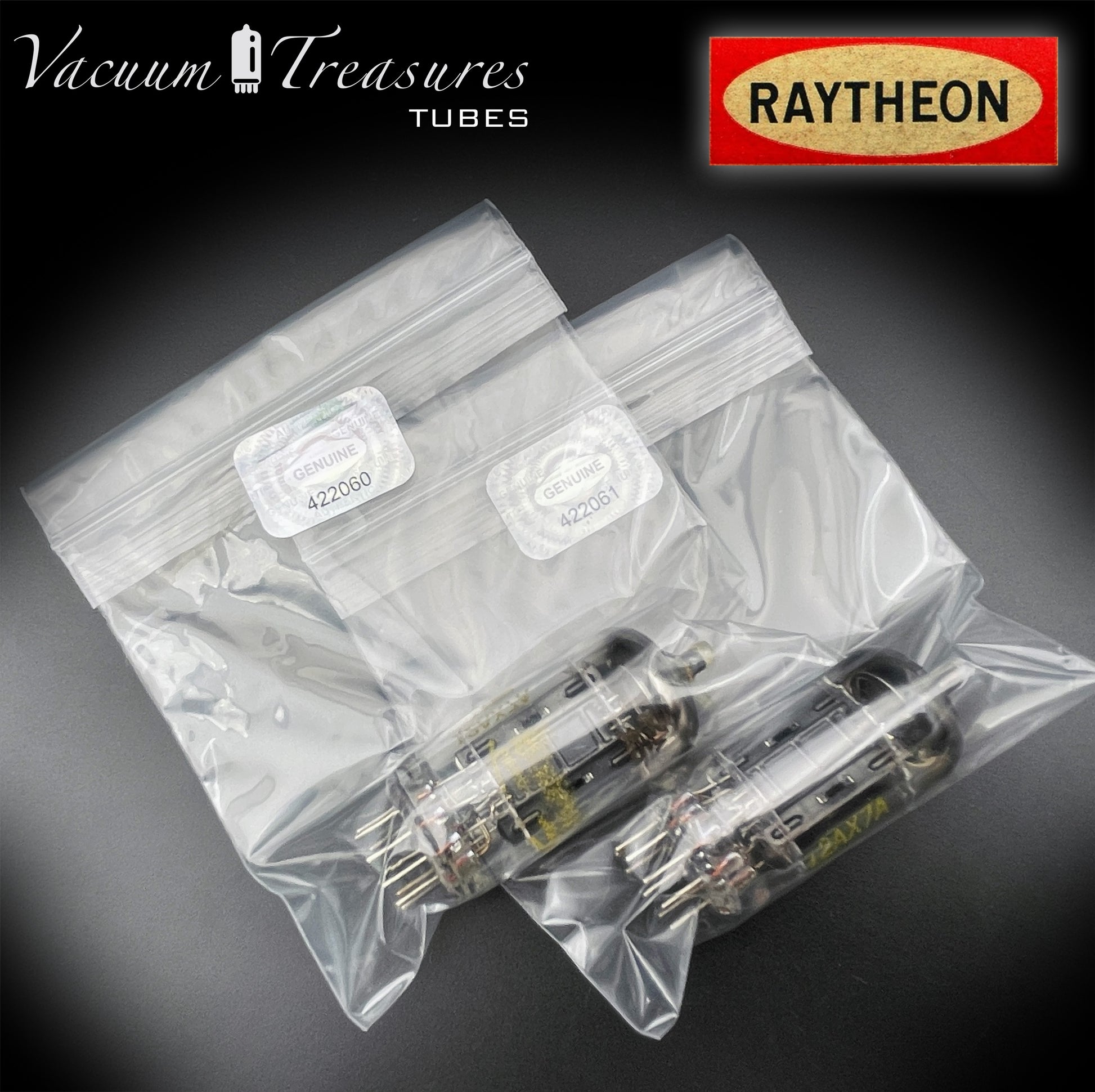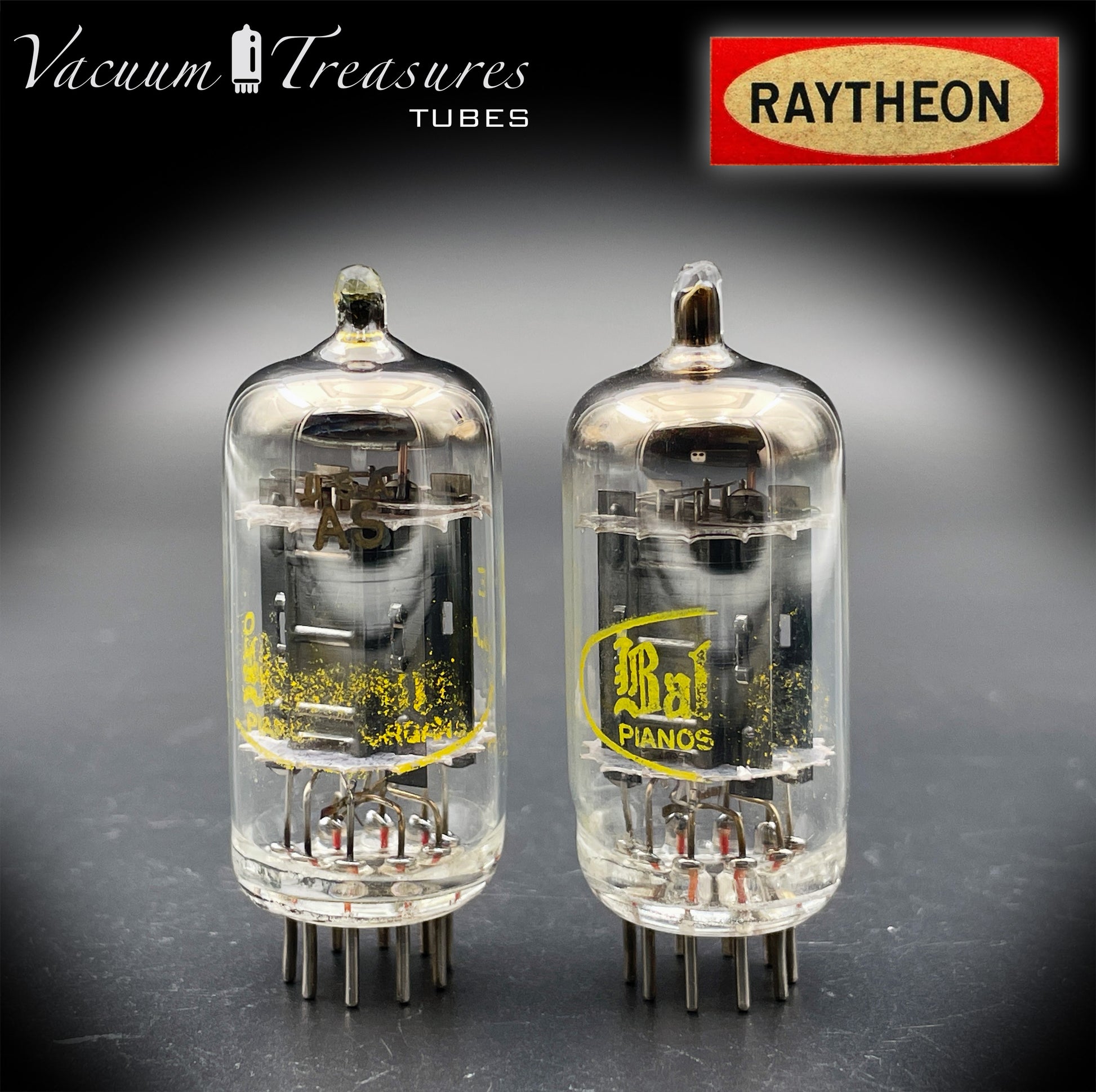 12AX7A ECC83 Baldwin Raytheon Matched Pair Tubes – Long Black Plates Halo Getter USA 1960s