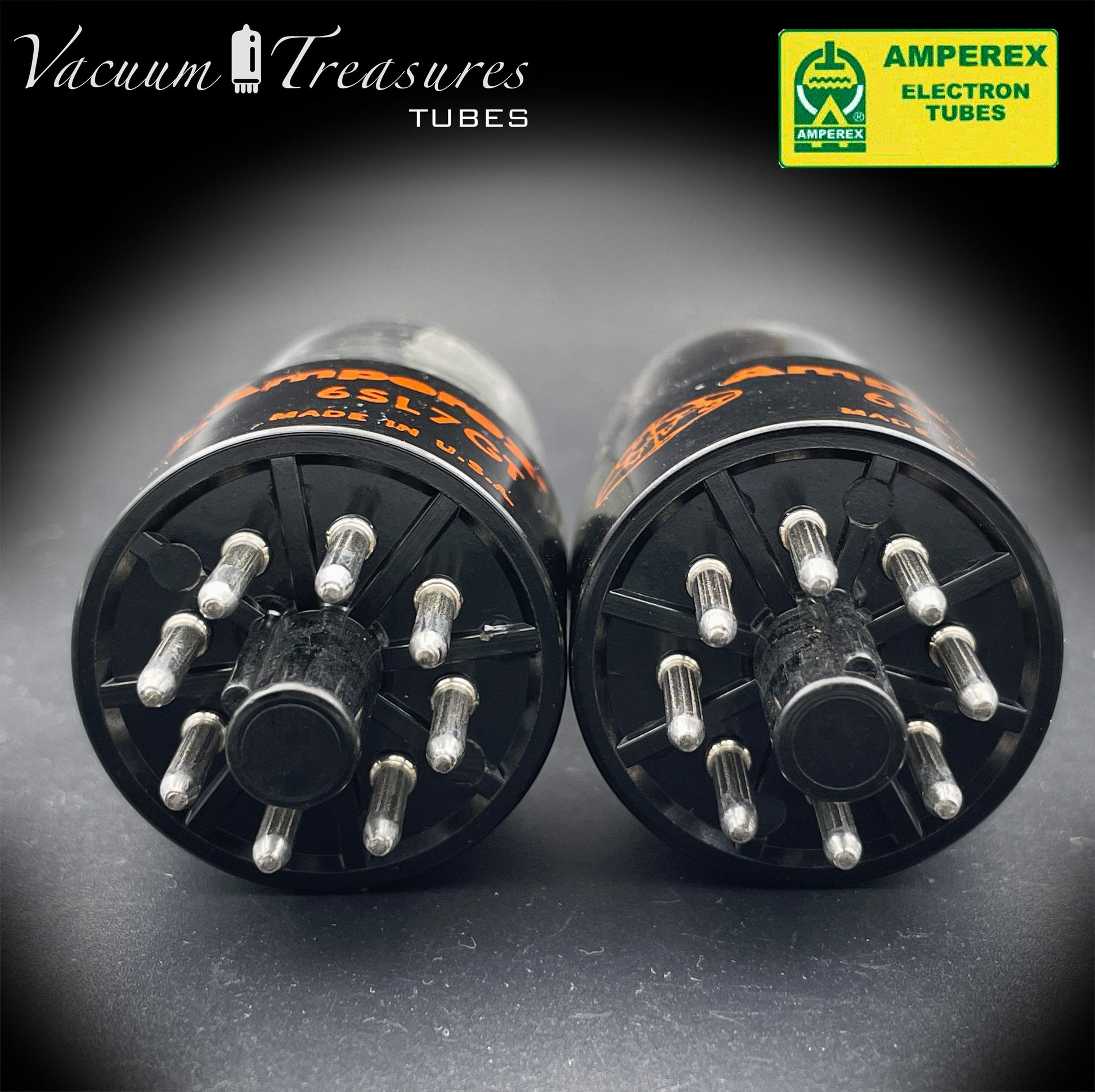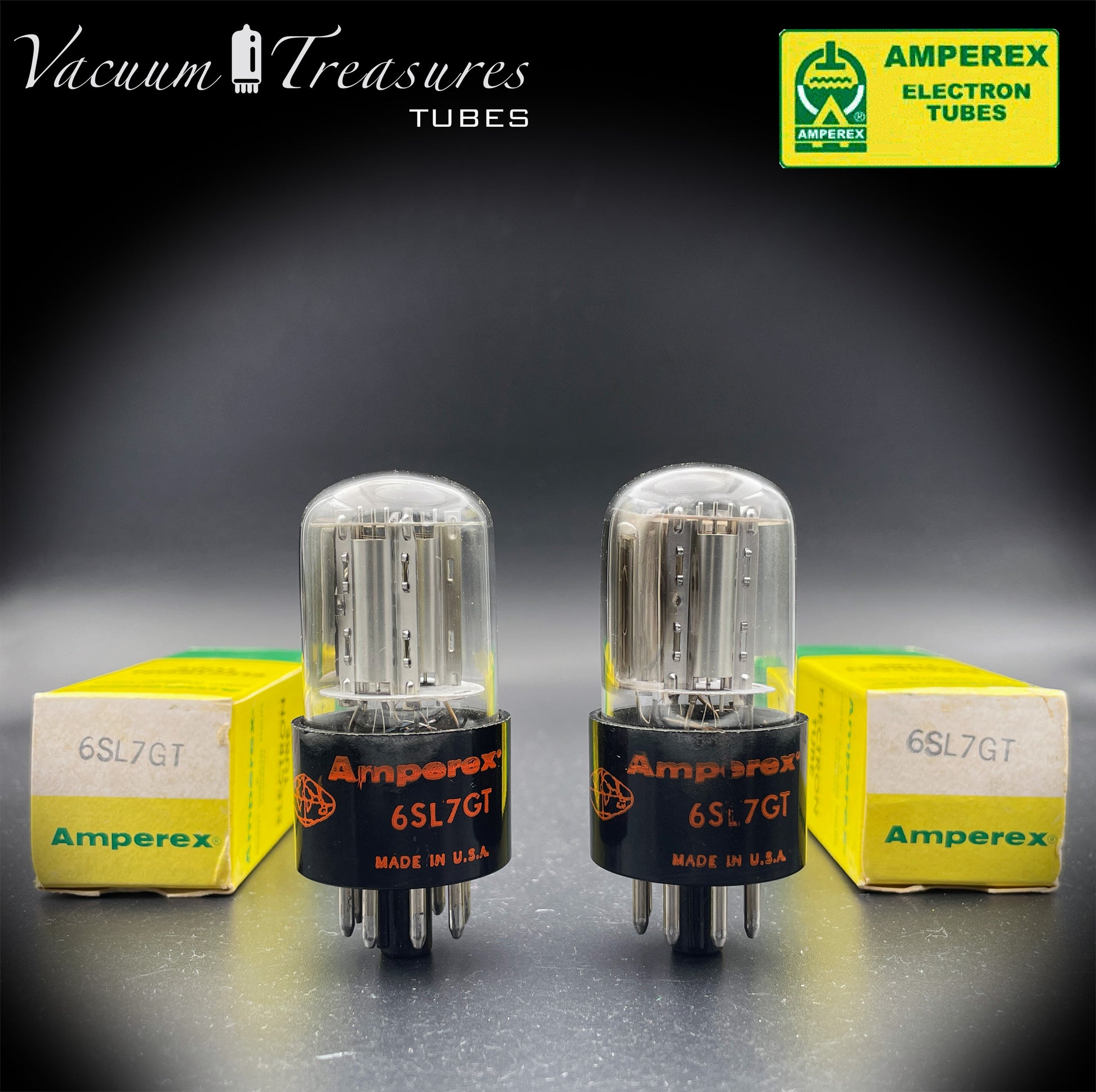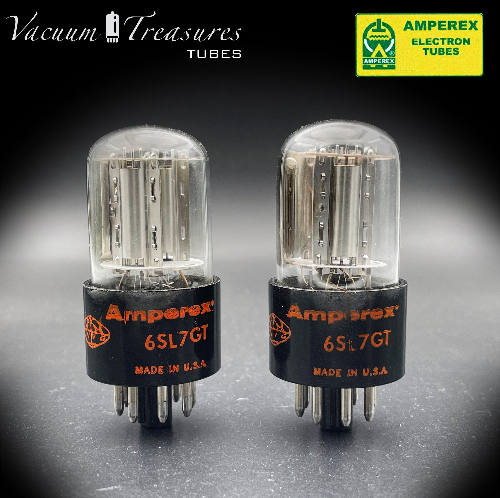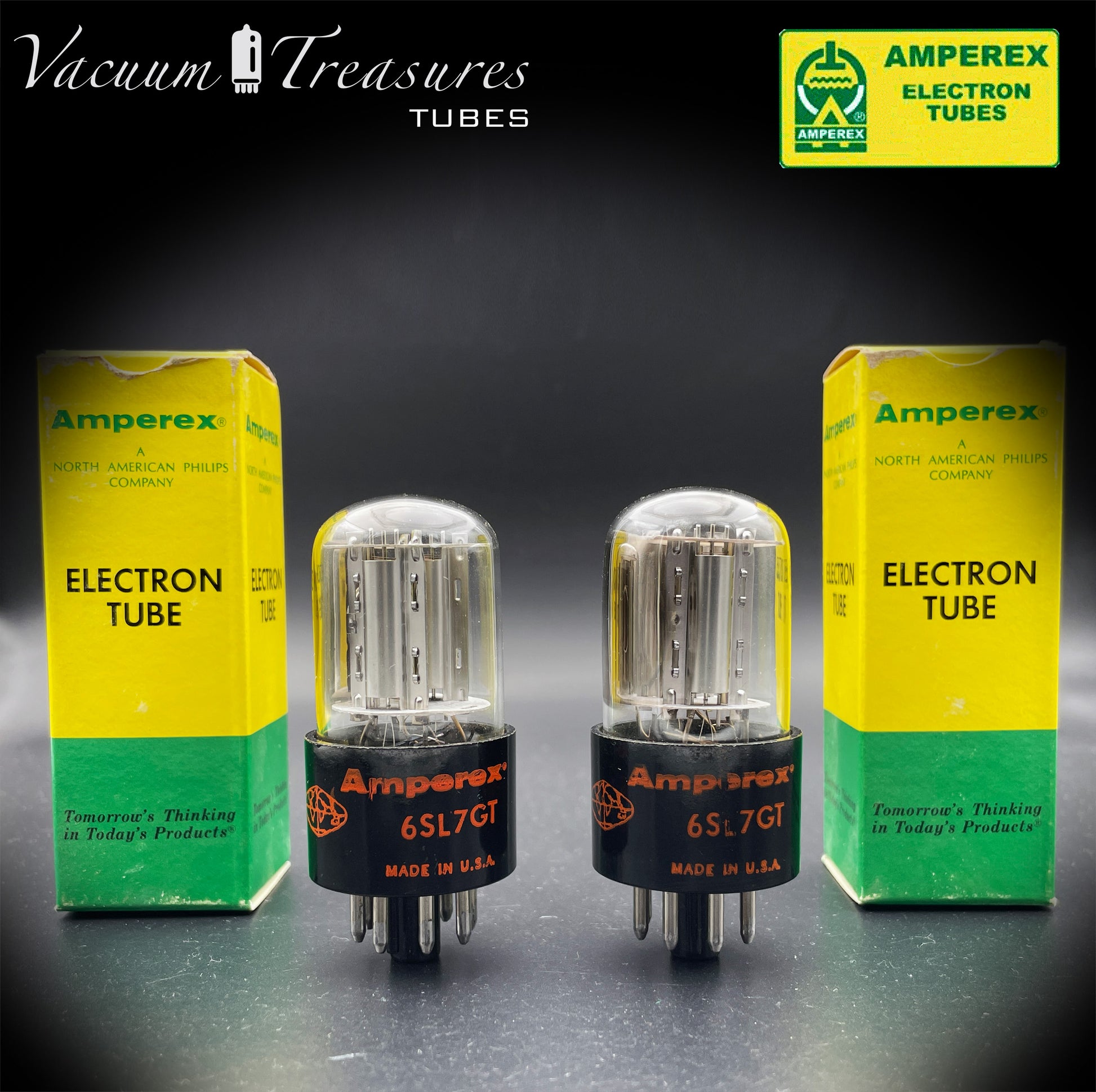 6SL7GT AMPEREX GLOBE Matched Pair Silver Plates Side Halo Getter Tubes USA 60s