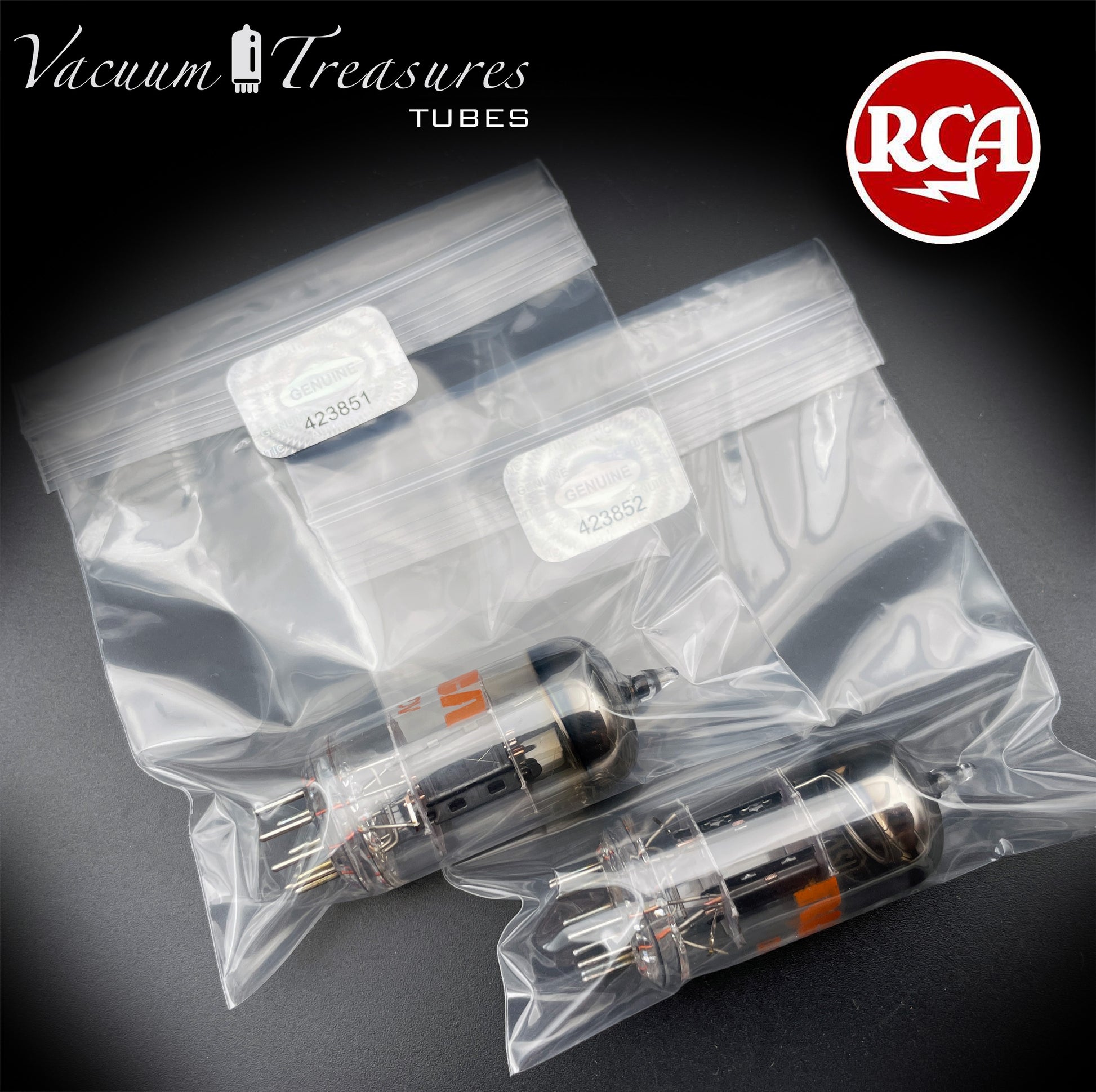 Questa coppia, rigorosamente NOS (New Old Stock) NIB (New in Box), è stata prodotta negli stabilimenti RCA negli Stati Uniti ed è equipaggiata con placche nere e getter ad anello (halo getter), tratti distintivi delle versioni di maggiore pregio della casa americana.