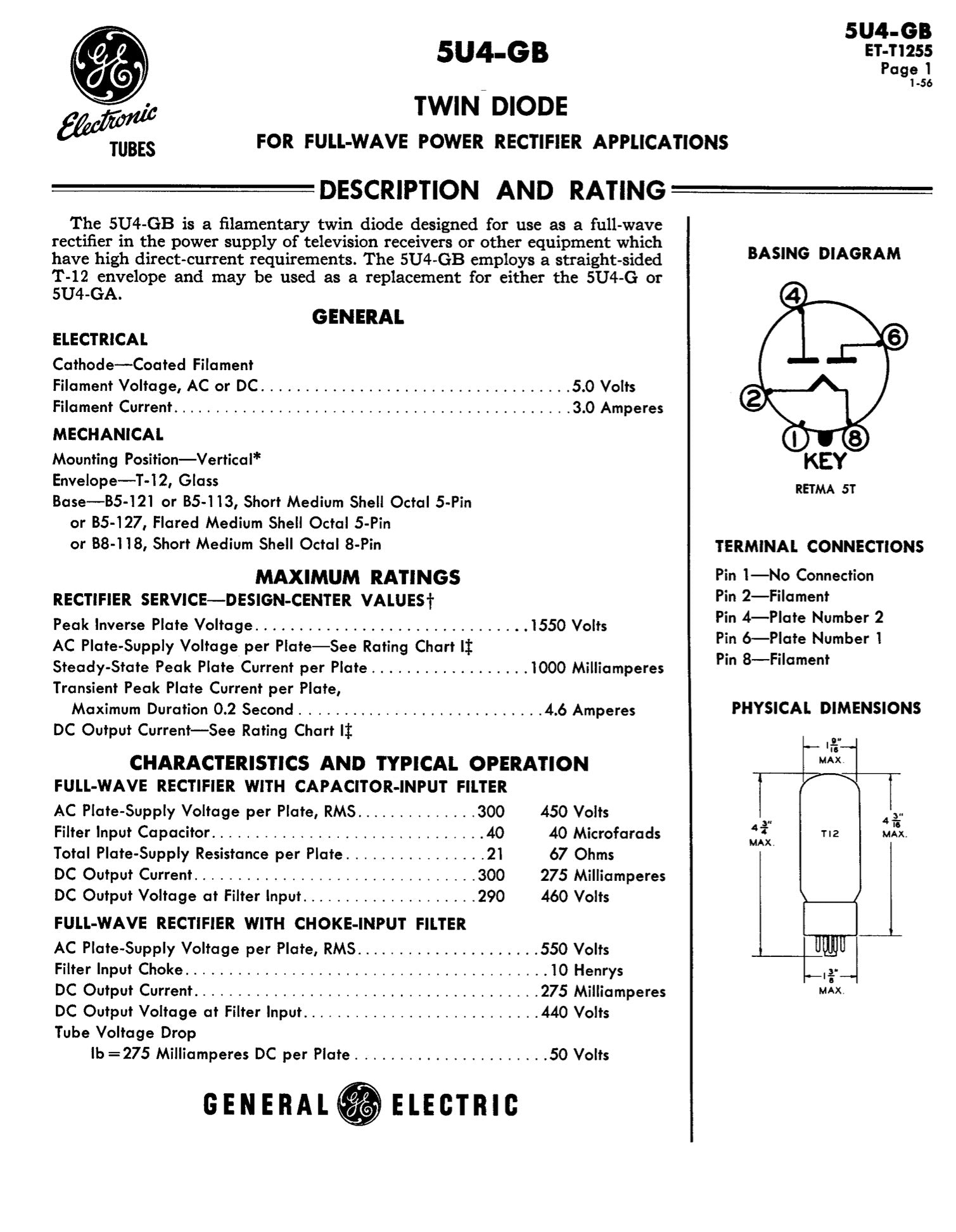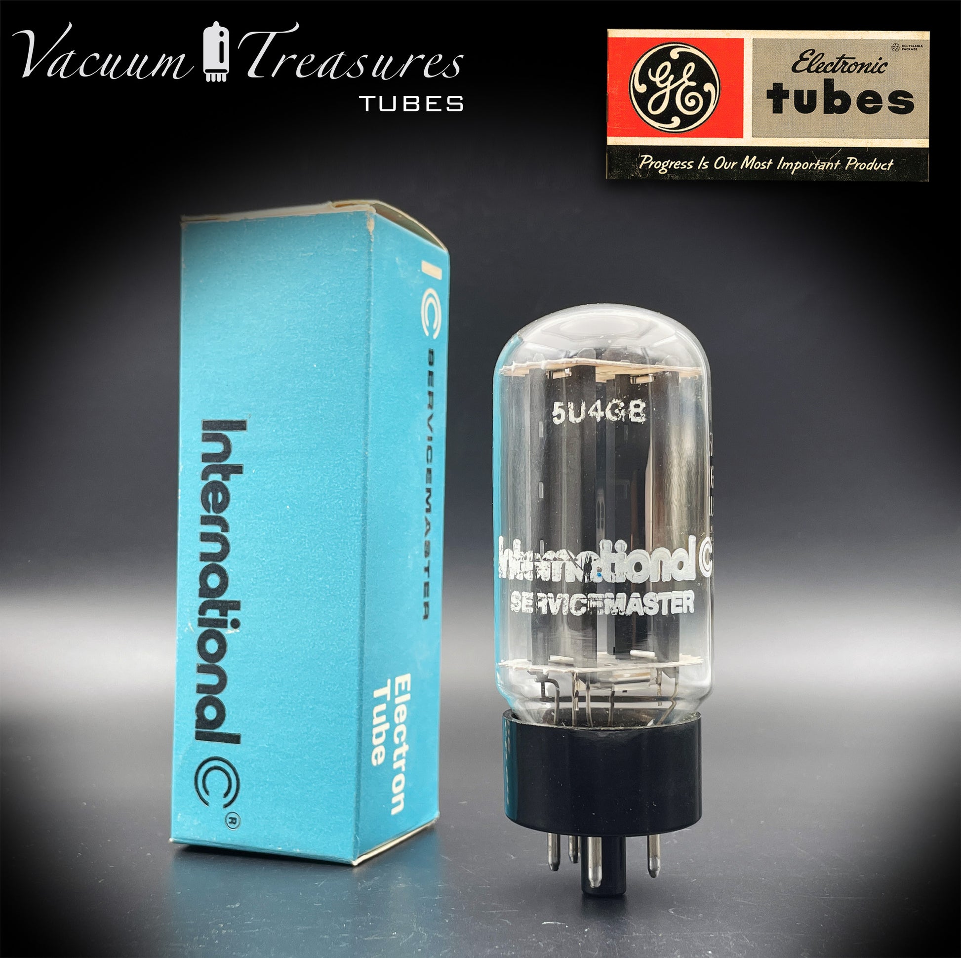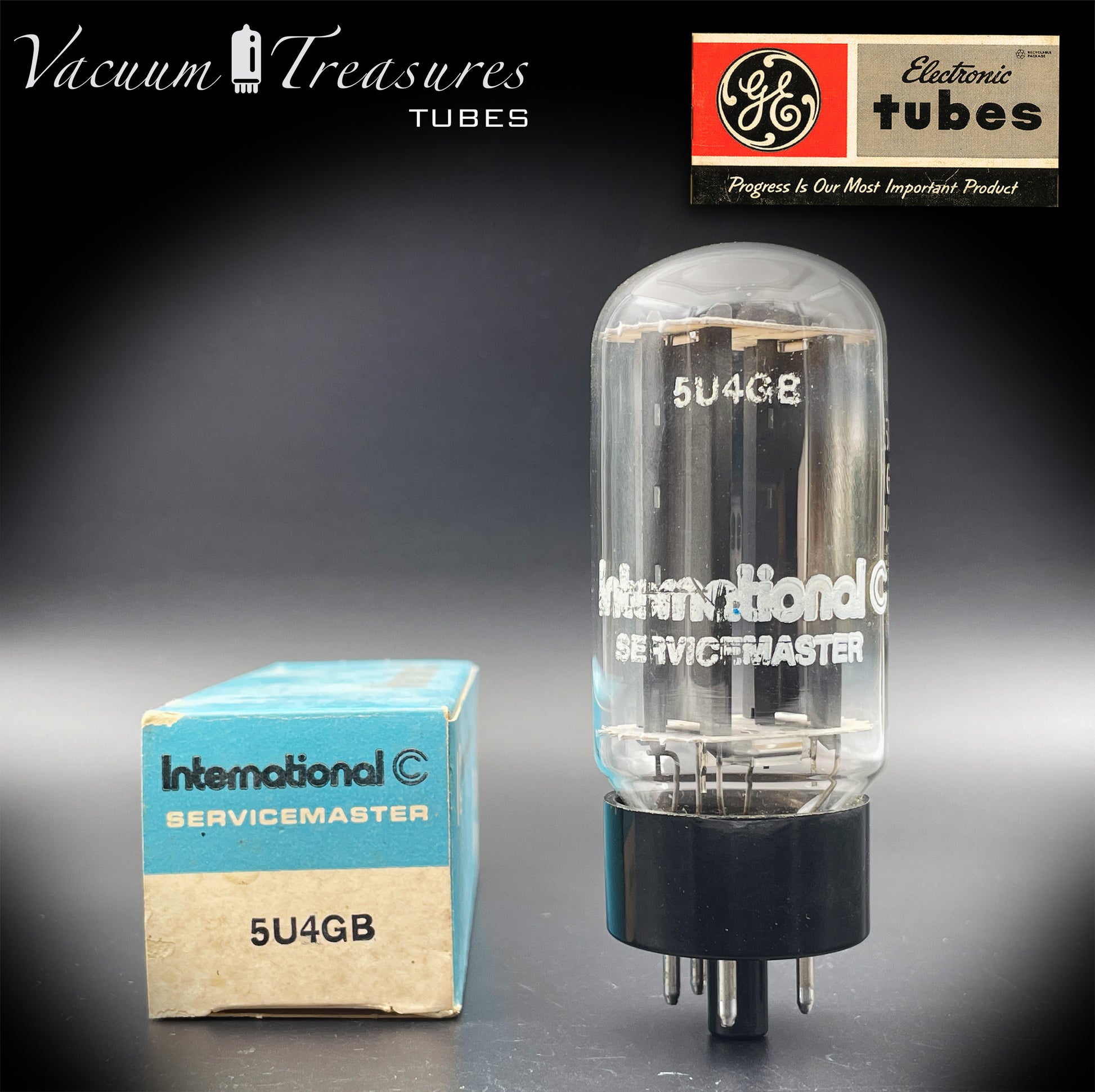 La 5U4GB / 5AS4A, prodotta negli Stati Uniti da General Electric (GE) e distribuita con marchio International, è qui proposta in condizioni NOS NIB (New Old Stock, New in Box) e testata per verificarne le prestazioni.