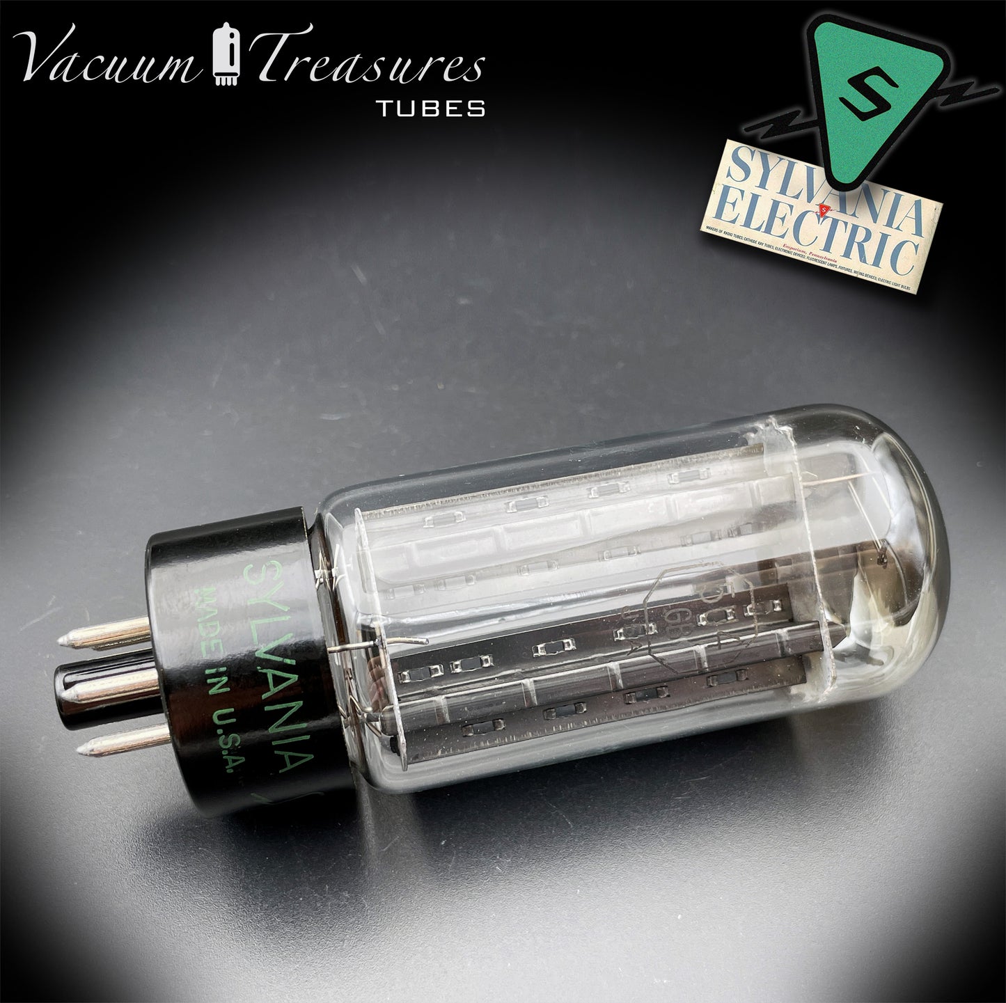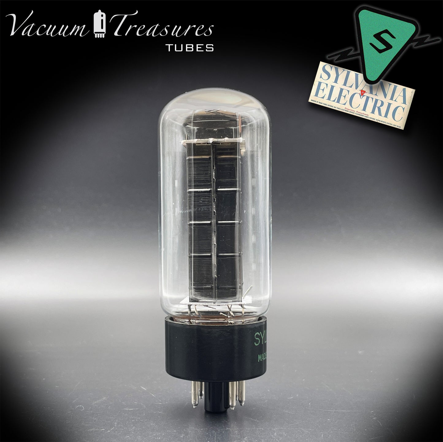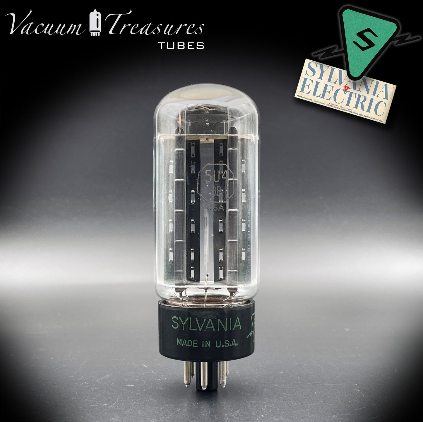 La 5U4GB / 5AS4A SYLVANIA, in questa rara versione NOS del 1946 con placche nere e getter a feritoia quadrata, rappresenta una delle prime generazioni postbelliche della celebre raddrizzatrice americana.